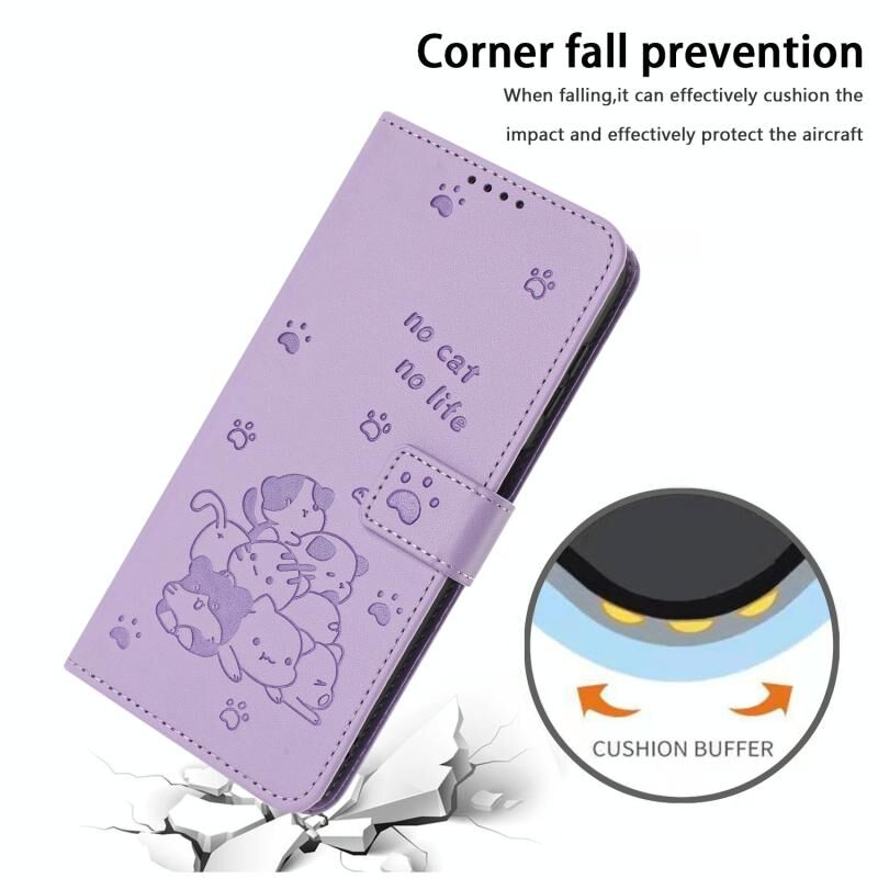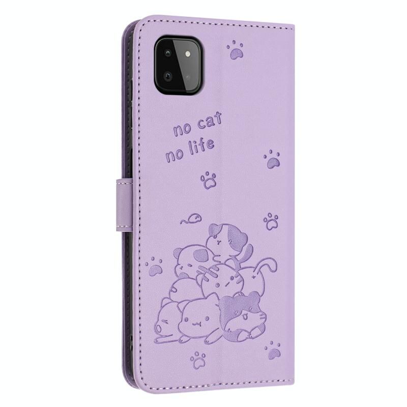 Θήκη δερμάτινη για Samsung Galaxy A22 5G / A22s 5G με ανάγλυφο σχέδιο γατάκι και κορδόνι (Μωβ)