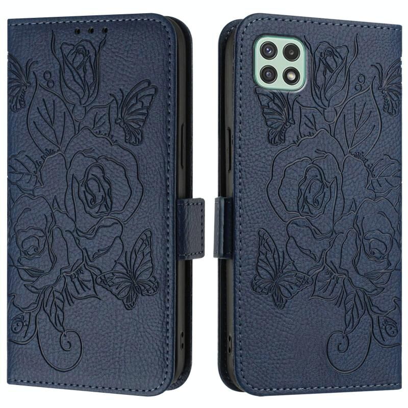 Για Samsung Galaxy A22 5G / A22s 5G / F42 ανάγλυφο Rose RFID Anti-theft Δερμάτινη θήκη τηλεφώνου (σκούρο μπλε)