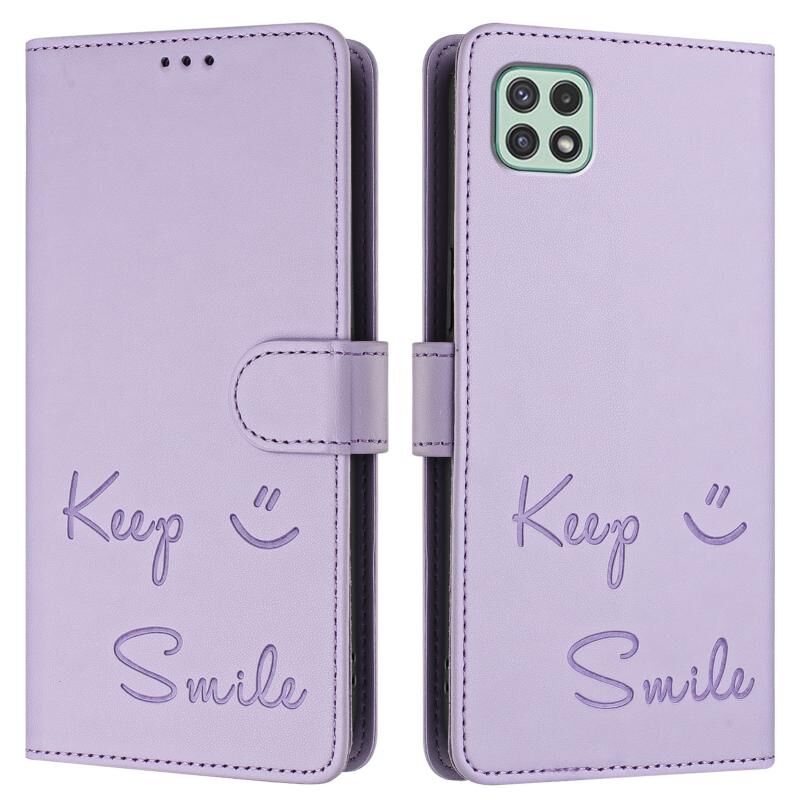 Για Samsung Galaxy A22 5G / A22s / F42 5G Χαμόγελο ανάγλυφο RFID δερμάτινη θήκη τηλεφώνου (ανοιχτό μοβ)