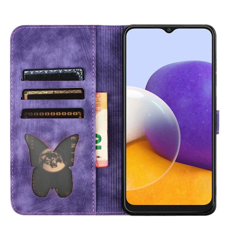 Θήκη τηλεφώνου Samsung Galaxy A22 5G, δερμάτινη, τύπου flip, με ανάγλυφο σχέδιο πεταλούδας και γάτας (Μωβ)