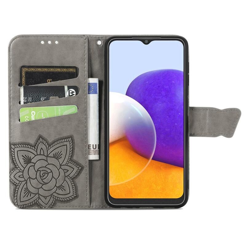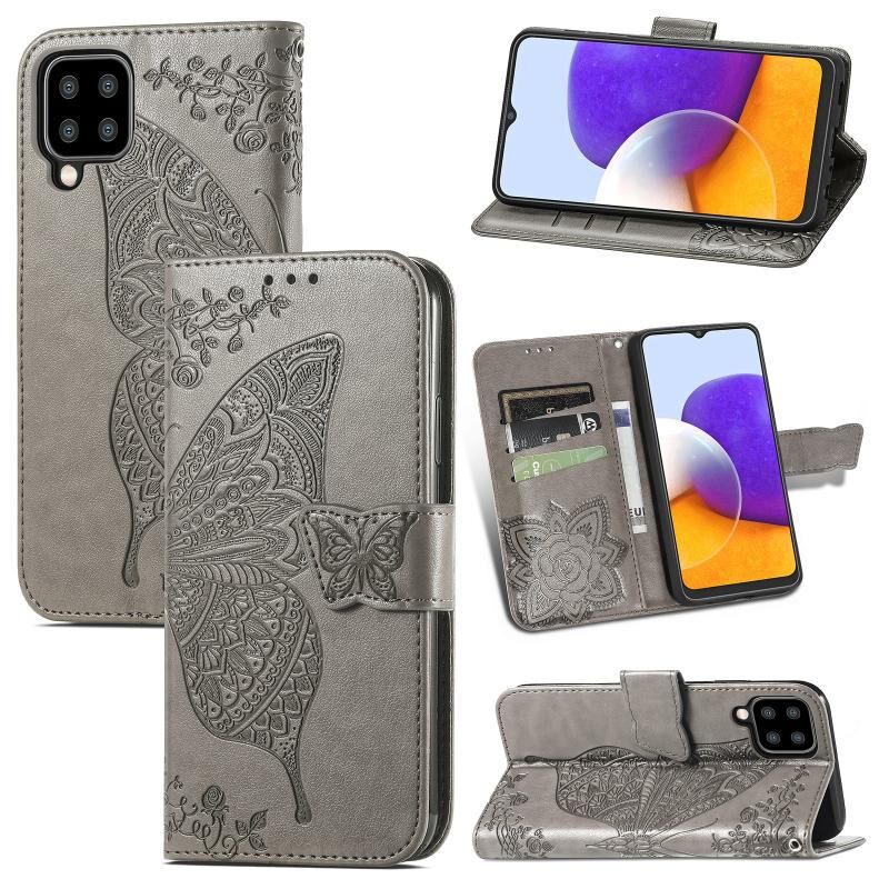 Για Samsung Galaxy A22 5G 5G πεταλούδα αγάπη λουλούδια ανάγλυφη οριζόντια Flip δερμάτινη θήκη με κάτοχο & υποδοχές για κάρτες & πορτοφόλι & κορδόνι (γκρι)