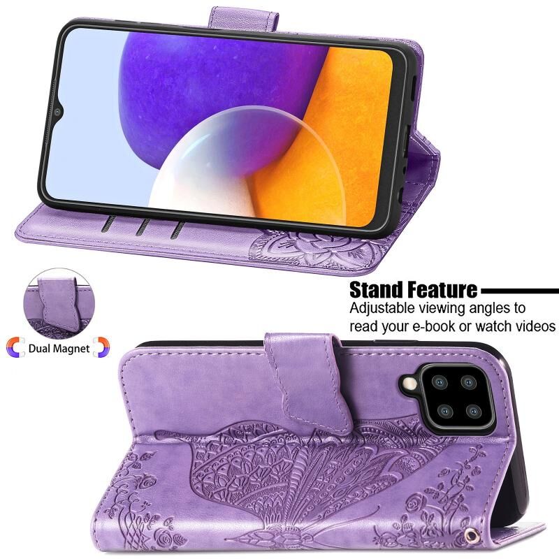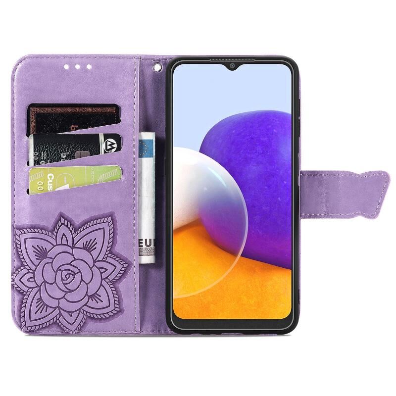 Για Samsung Galaxy A22 5G 5G πεταλούδα αγάπη λουλούδια ανάγλυφη οριζόντια Flip δερμάτινη θήκη με κάτοχο & υποδοχές για κάρτες & πορτοφόλι & κορδόνι (ανοιχτό μοβ)
