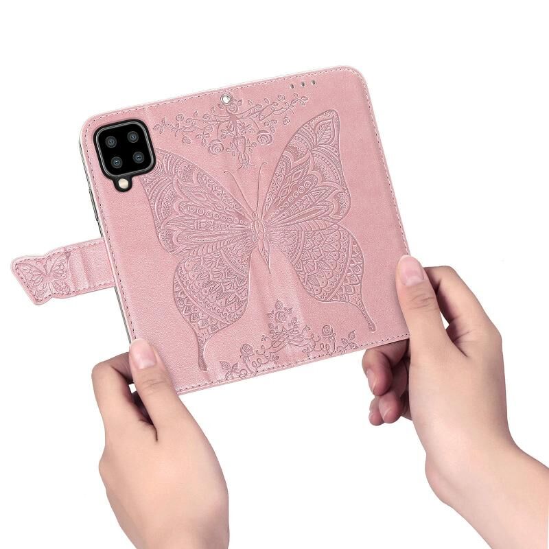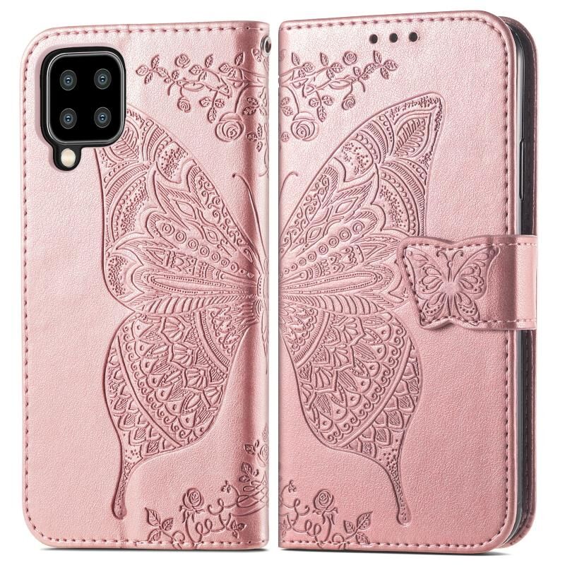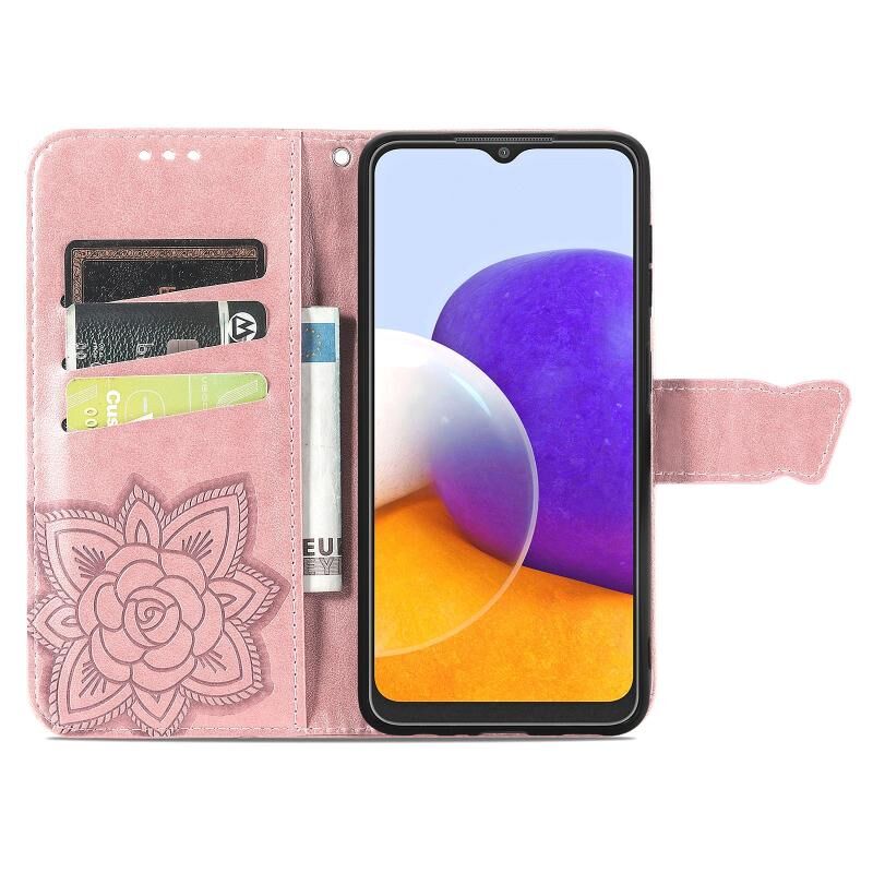 Για Samsung Galaxy A22 5G 5G πεταλούδα αγάπη λουλούδια ανάγλυφο οριζόντια Flip δερμάτινη θήκη με κάτοχο & υποδοχές για κάρτες & πορτοφόλι & κορδόνι (Rose Gold)