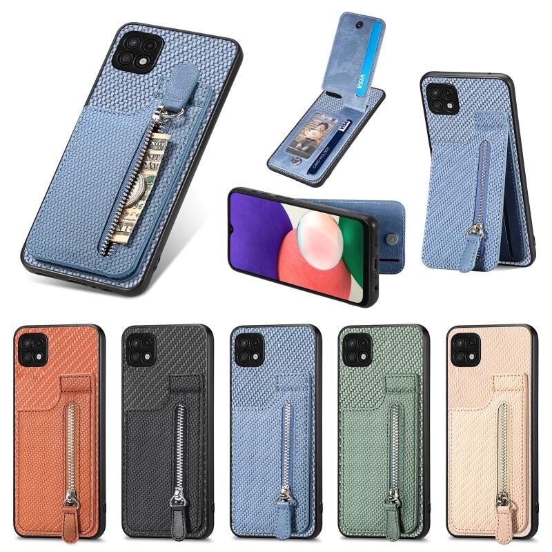 Για Samsung Galaxy A22 5G ινών άνθρακα 5G Κάθετη Flip φερμουάρ υπόθεση τηλεφώνου (Καφέ)