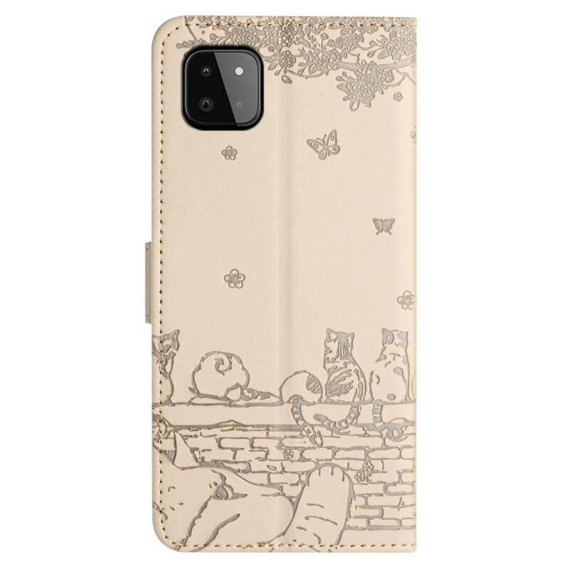 Θήκη τηλεφώνου Samsung Galaxy A22 5G με ανάγλυφο σχέδιο γάτας από δέρμα με κορδόνι (Μπεζ)