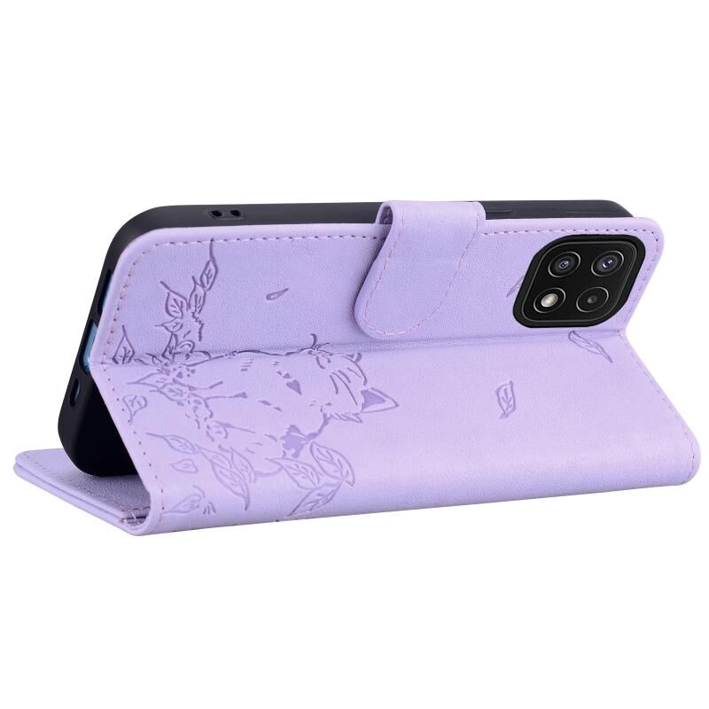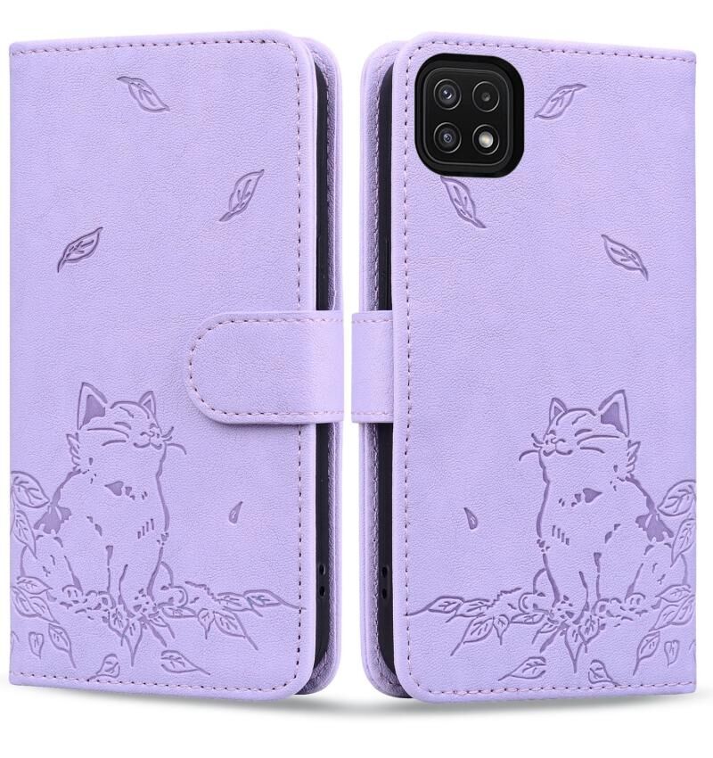 Θήκη τηλεφώνου δερμάτινη ανάγλυφη με χαριτωμένη γάτα για Samsung Galaxy A22 5G (Πράσινο)