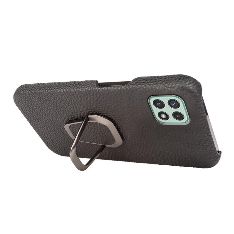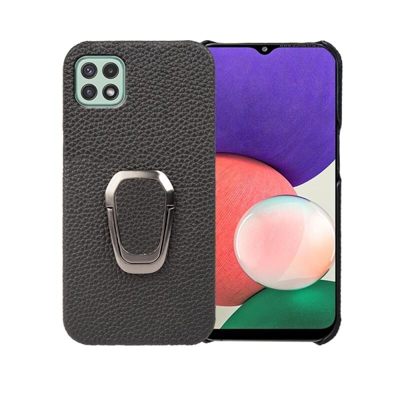 Θήκη τηλεφώνου από γνήσιο δέρμα με υφή λύτσι για Samsung Galaxy A22 5G/F42 5G (Μαύρο) με δακτύλιο στήριξης.