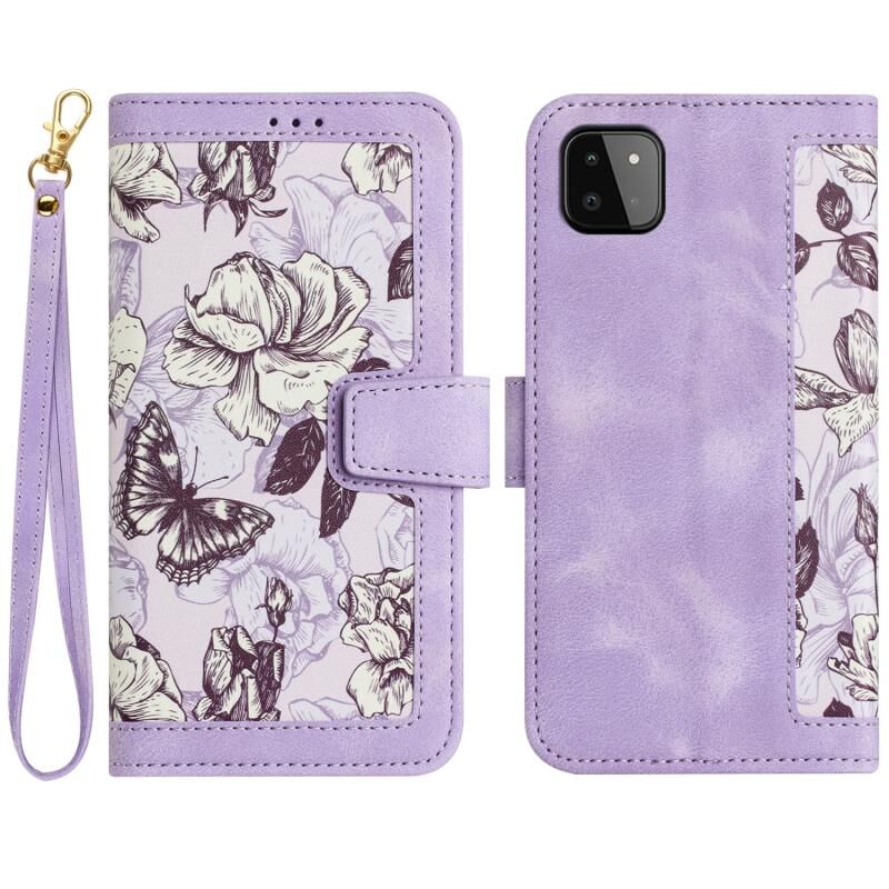 Θήκη τηλεφώνου Samsung Galaxy A22 5G με λουλουδάτο σχέδιο και δερμάτινη υφή, με κορδόνι (ανοιχτό μπλε)
