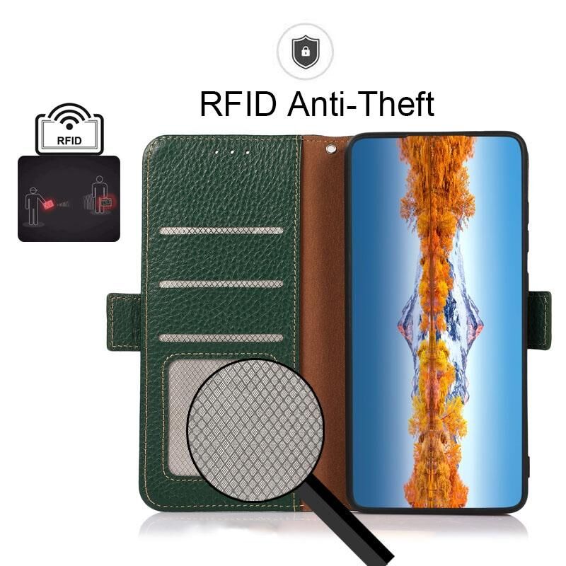 Θήκη τηλεφώνου Samsung Galaxy A22 5G JP Version KHAZNEH με μαγνητικό κλείσιμο στο πλάι, από γνήσιο δέρμα Litchi, με προστασία RFID (πράσινο)