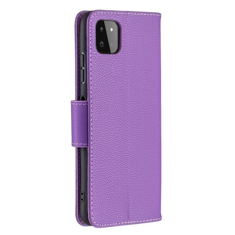 Για Samsung Galaxy A22 5G Litchi υφή καθαρό χρώμα οριζόντια Flip δερμάτινη θήκη με θήκη & υποδοχές για κάρτες & πορτοφόλι & κορδόνι (μωβ)