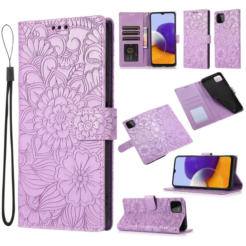 Για Samsung Galaxy A22 5G δέρμα αίσθηση ανάγλυφο ηλιοτρόπιο οριζόντια Flip δερμάτινη θήκη με κάτοχο & υποδοχές για κάρτες & πορτοφόλι & κορδόνι (μωβ)