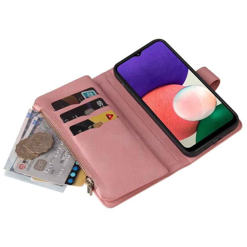 Για το Samsung Galaxy A22 5G Skin Feel PU + TPU Οριζόντια Flip δερμάτινη θήκη με θήκη για 15 κάρτες & υποδοχή & πορτοφόλι & τσέπη με φερμουάρ & κορδόνι (ροζ)