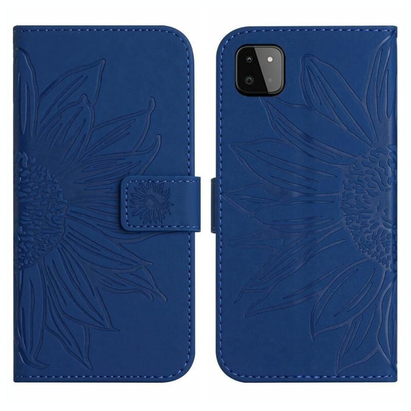 Για το Samsung Galaxy A22 5G δέρμα αίσθηση Sun Flower μοτίβο Flip δέρμα τηλέφωνο υπόθεση με κορδόνι (σκούρο μπλε)