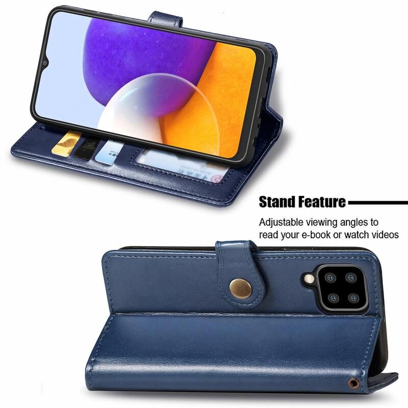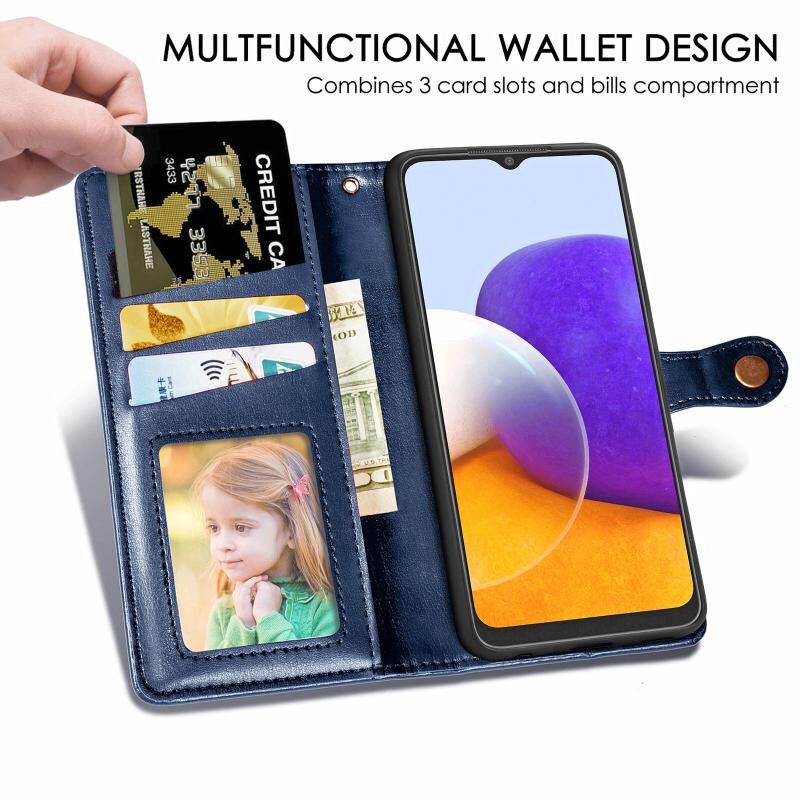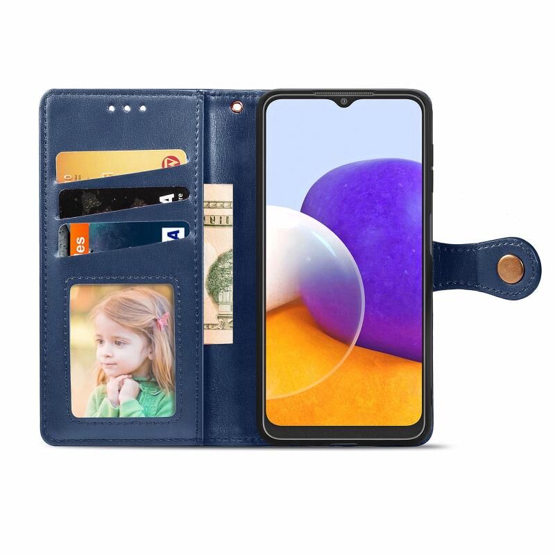 Για Samsung Galaxy A22 5G Αμιγές χρώμα δέρμα αγκράφα υπόθεση τηλεφώνου με κορδόνι & πλαίσιο φωτογραφιών & υποδοχή για κάρτες & πορτοφόλι & λειτουργία Stand (μπλε)