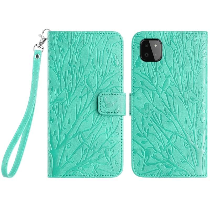 For Samsung Galaxy A22 5G Tree Birds Embossed Pattern Leather Phone Case(Green)