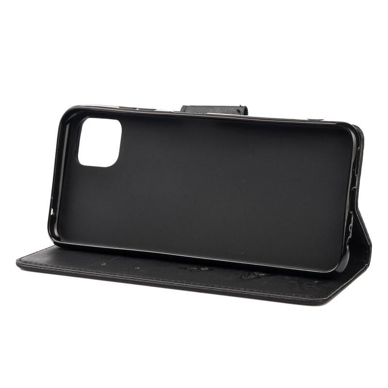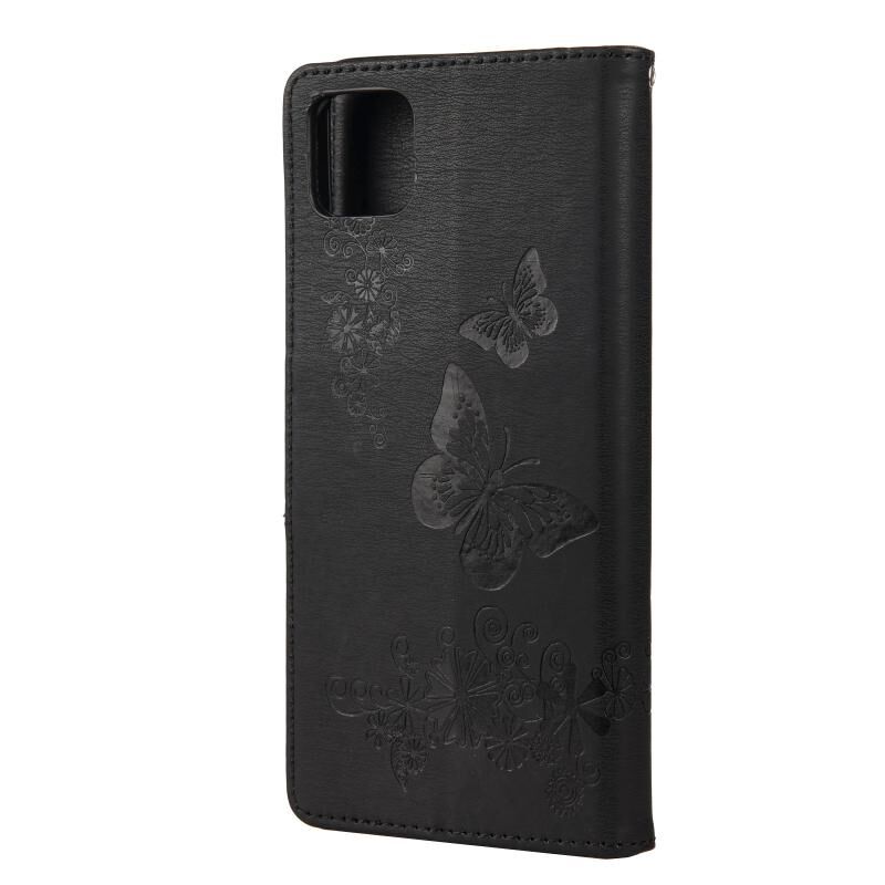 Θήκη Samsung Galaxy A22 5G Vintage ανάγλυφο λουλουδάτο σχέδιο πεταλούδας οριζόντια δερμάτινη με θήκη για κάρτες, στήριξη, πορτοφόλι & λουρί (Μαύρο)