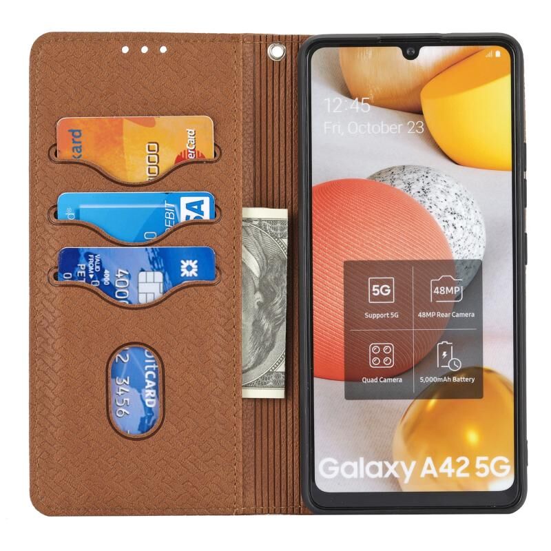 Για Samsung Galaxy A22 5G υφαντή υφή ραφή μαγνητική οριζόντια Flip PU δέρμα υπόθεση με θήκη & υποδοχές για κάρτες & πορτοφόλι & κορδόνι (καφέ)