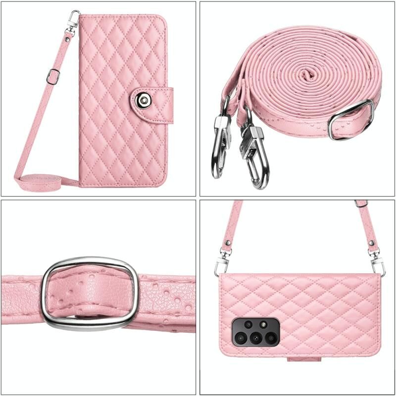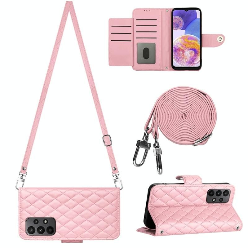 Για Samsung Galaxy A23 4G / F23 5G Rhombic υφή Flip δερμάτινη θήκη τηλεφώνου με μακρύ κορδόνι (ροζ)