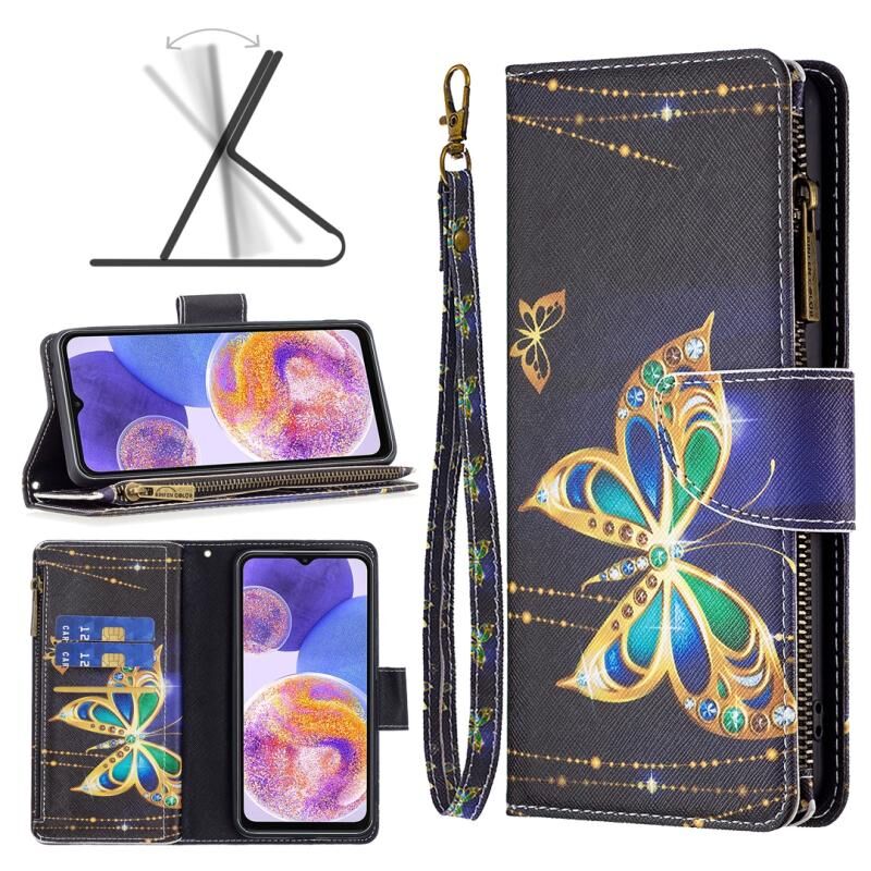 Θήκη τηλεφώνου Samsung Galaxy A23 5G από δέρμα με φερμουάρ και πολύχρωμο σχέδιο (Μεγάλη Πεταλούδα)