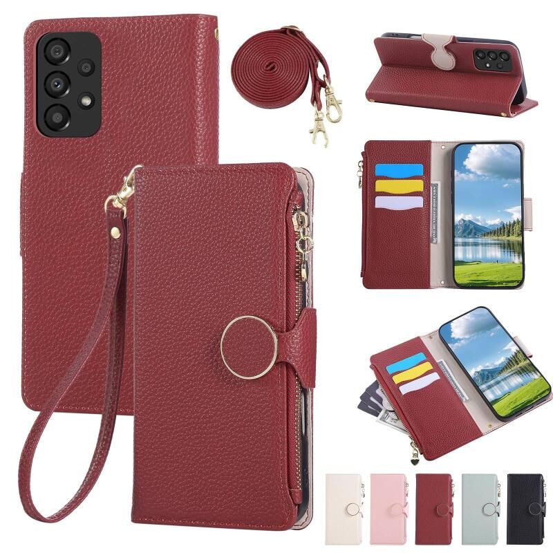 Θήκη τηλεφώνου Samsung Galaxy A23 5G από δέρμα με αγκράφα και φερμουάρ, με λουρί crossbody (Ροζ)