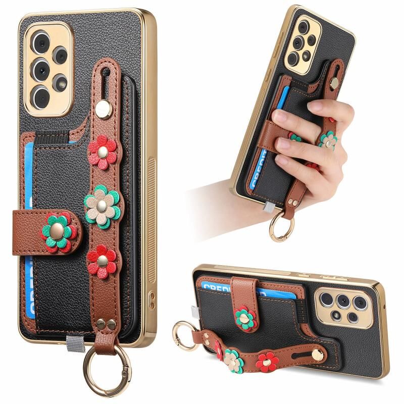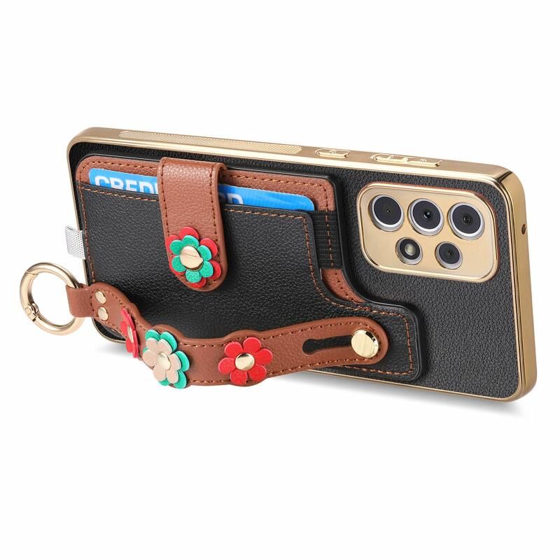 Για Samsung Galaxy A23 5G Στερεοσκοπική λουλούδια Wristband κάρτα τσάντα υπόθεση τηλεφώνου (Μαύρο)
