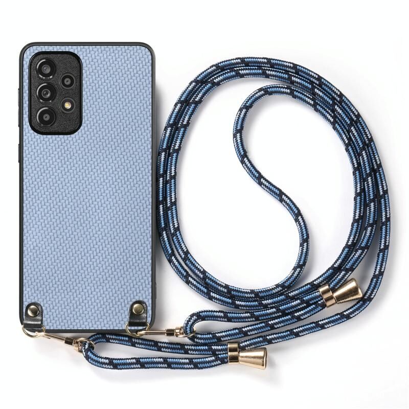 Για Samsung Galaxy A23 Carbon Fiber Texture δέρμα πίσω κάλυμμα τηλέφωνο υπόθεση με λουράκι σταυρού (Μπλε)
