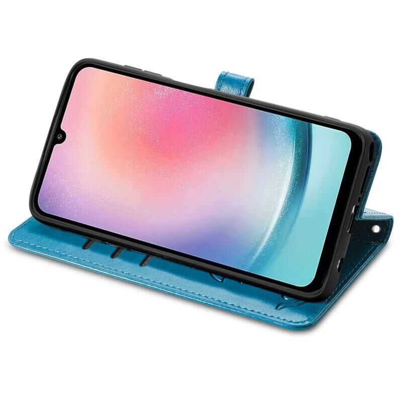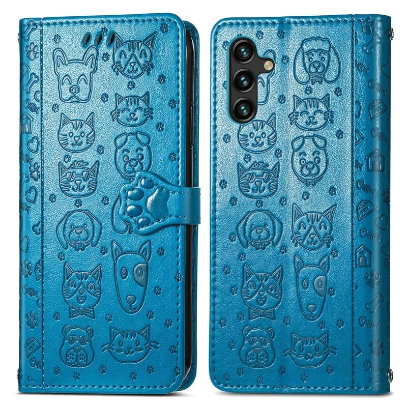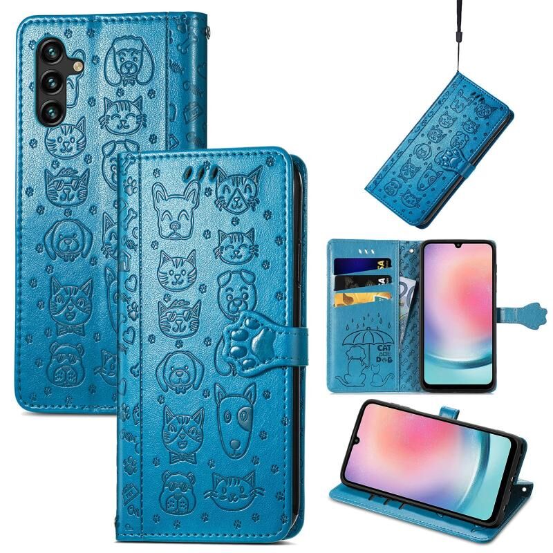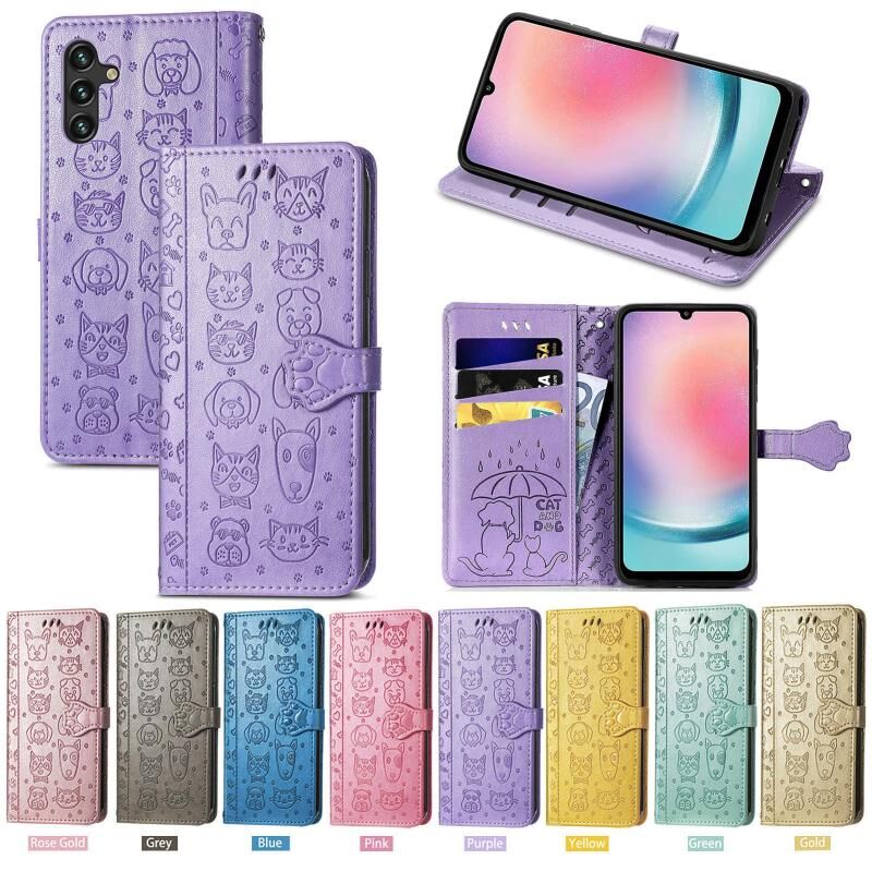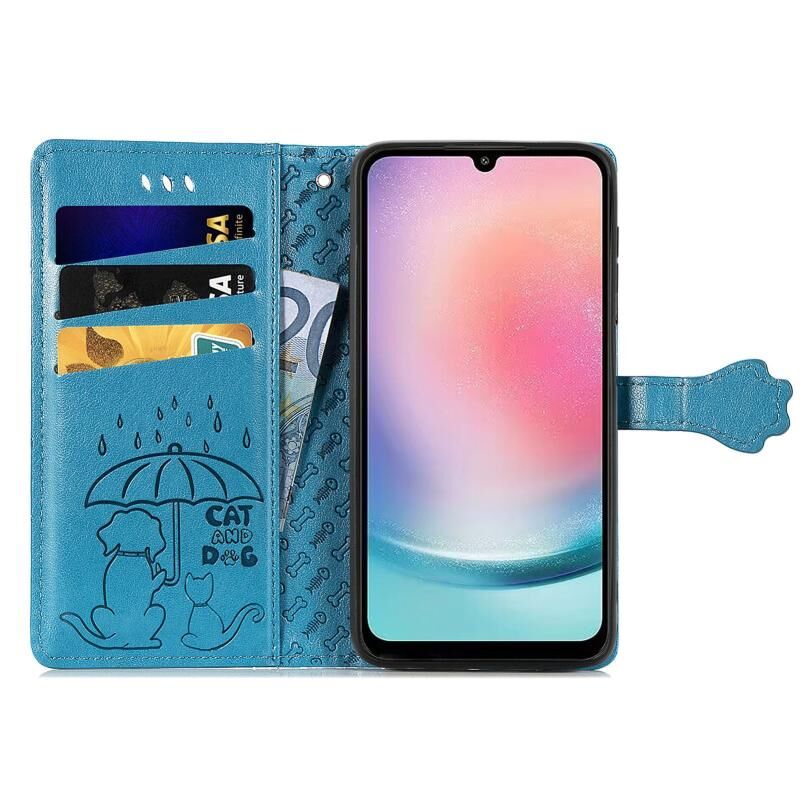 Θήκη τηλεφώνου Samsung Galaxy A24 4G, δερμάτινη, με ανάγλυφα σχέδια γατιού και σκύλου (Χρυσό ροζ)