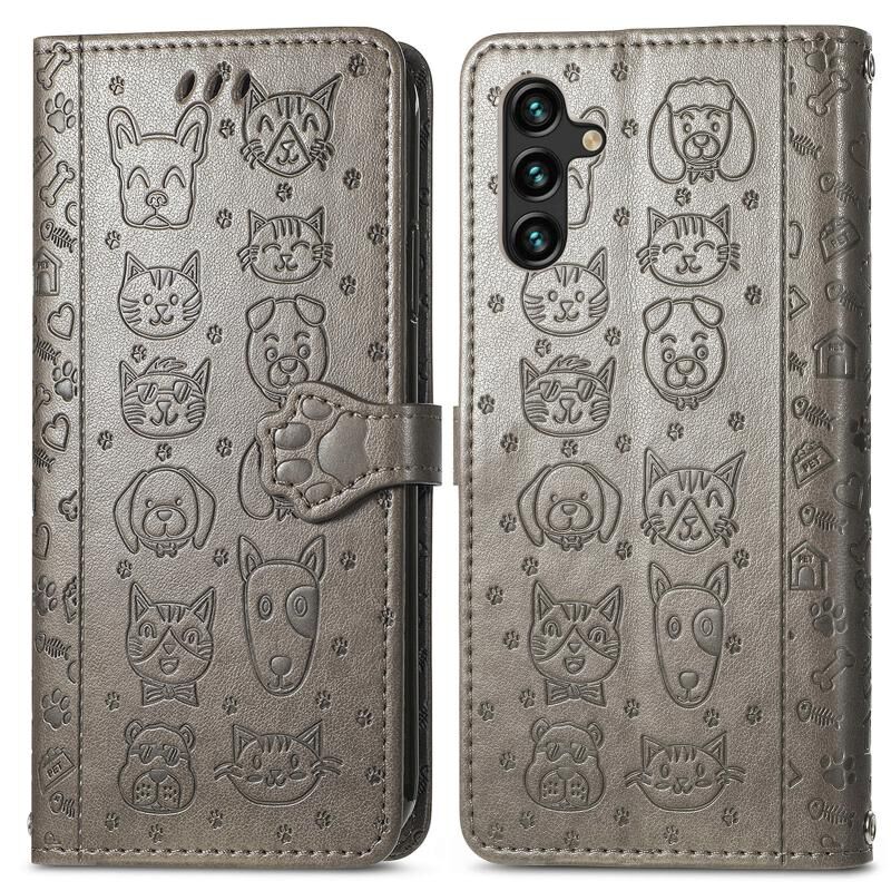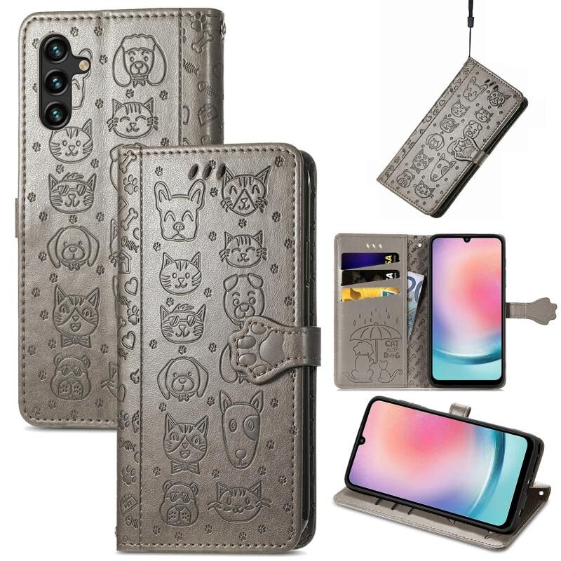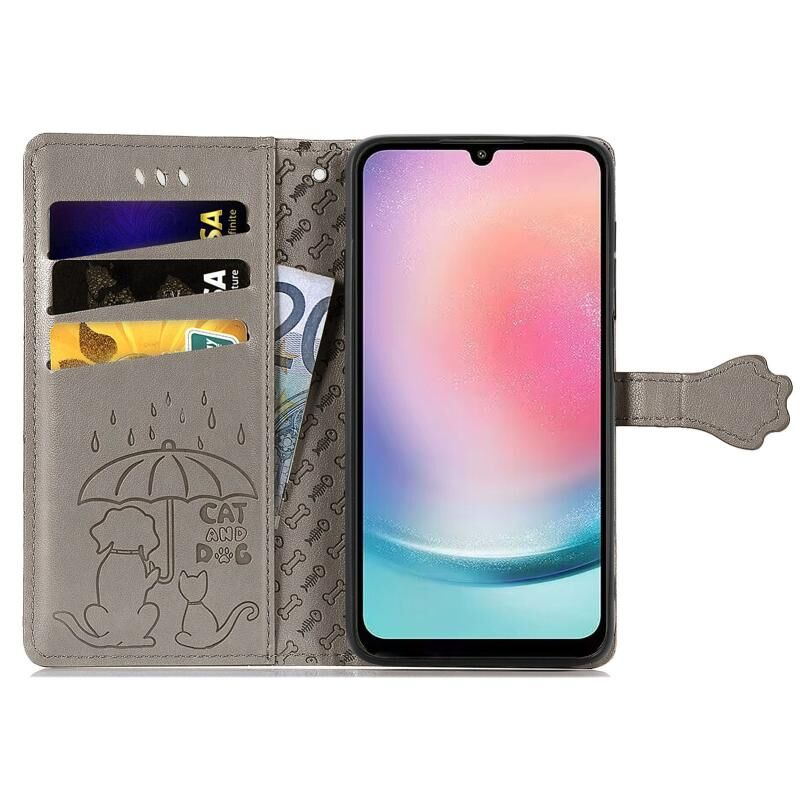 Θήκη τηλεφώνου Samsung Galaxy A24 4G, δερμάτινη, με ανάγλυφα σχέδια γατιού και σκύλου (Χρυσό ροζ)