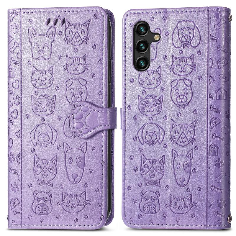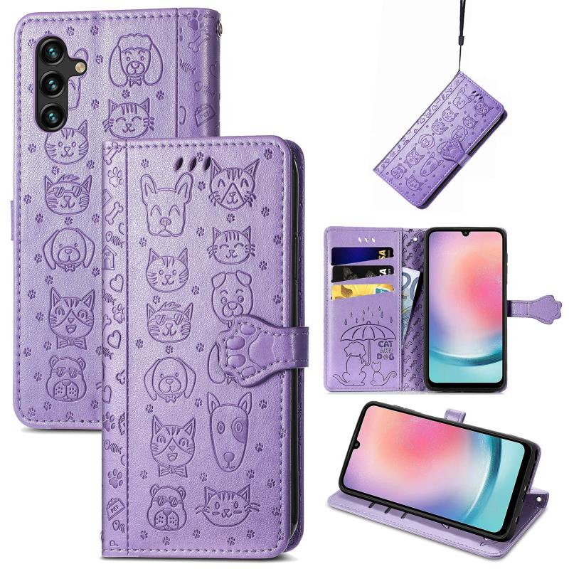 For Samsung Galaxy A24 4G Cute Cat and Dog Embossed Flip Leather Phone Case(Purple)