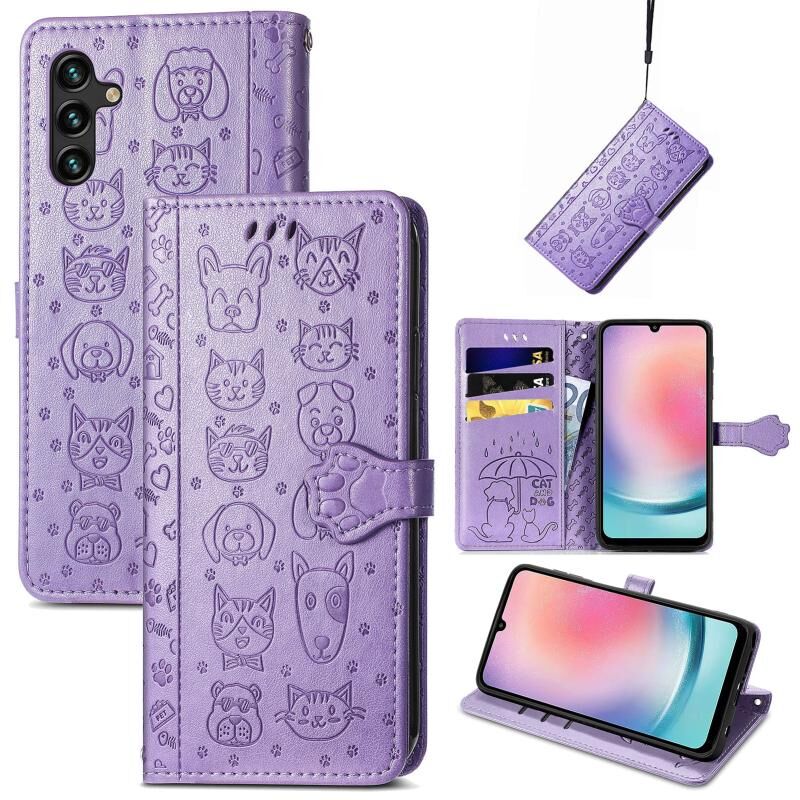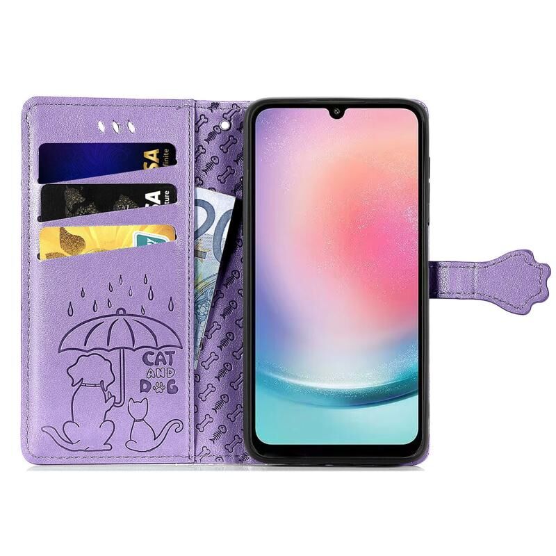 Θήκη τηλεφώνου Samsung Galaxy A24 4G, δερμάτινη, με ανάγλυφα σχέδια γατιού και σκύλου (Χρυσό ροζ)