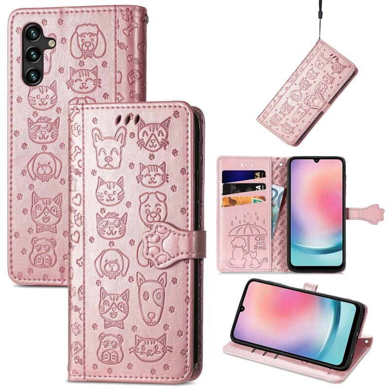 Θήκη τηλεφώνου Samsung Galaxy A24 4G, δερμάτινη, με ανάγλυφα σχέδια γατιού και σκύλου (Χρυσό ροζ)