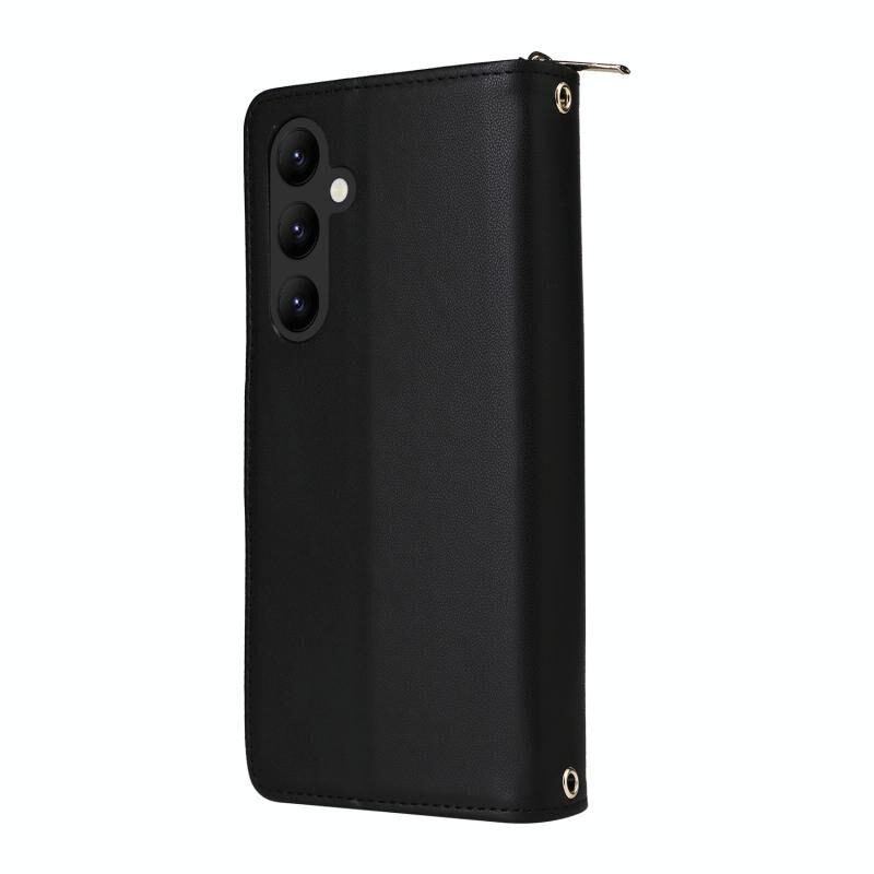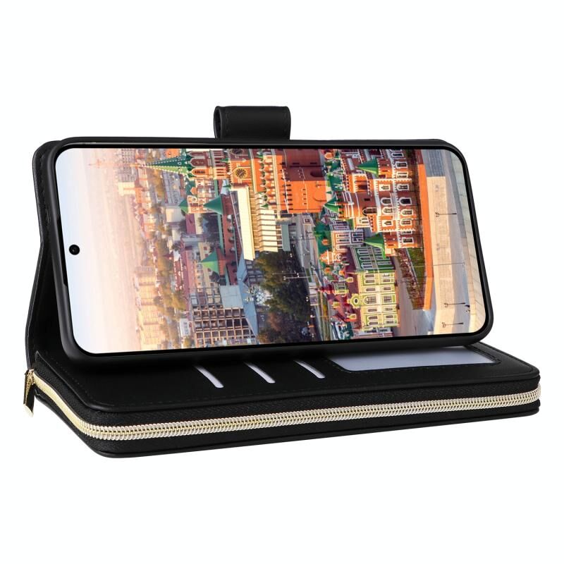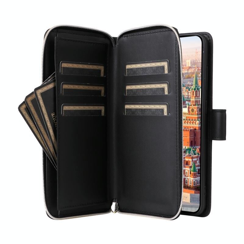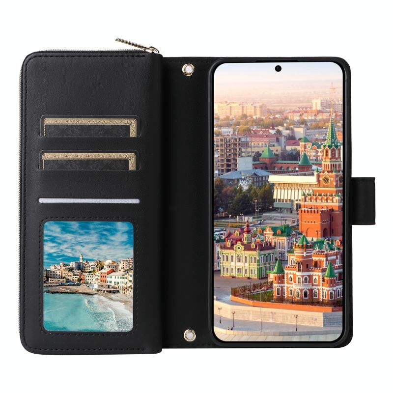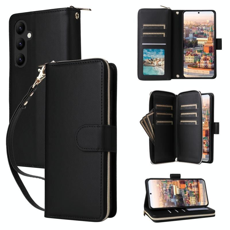 Για Samsung Galaxy A24 εννέα-κάρτα Slots φερμουάρ πορτοφόλι τσάντα δέρμα υπόθεση τηλεφώνου (μαύρο)