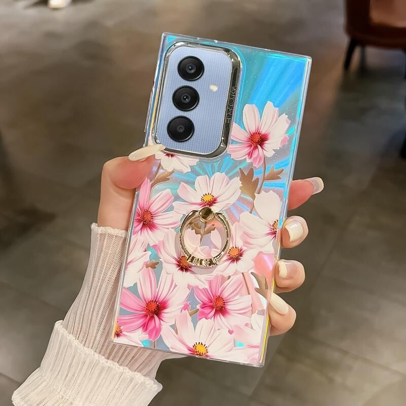 Θήκη κινητού τηλεφώνου Samsung Galaxy A25 5G TPU με δακτύλιο στήριξης και σχέδιο λουλουδιών με λέιζερ και ηλεκτρολυτική επικάλυψη (Cosmos Flower AH7)