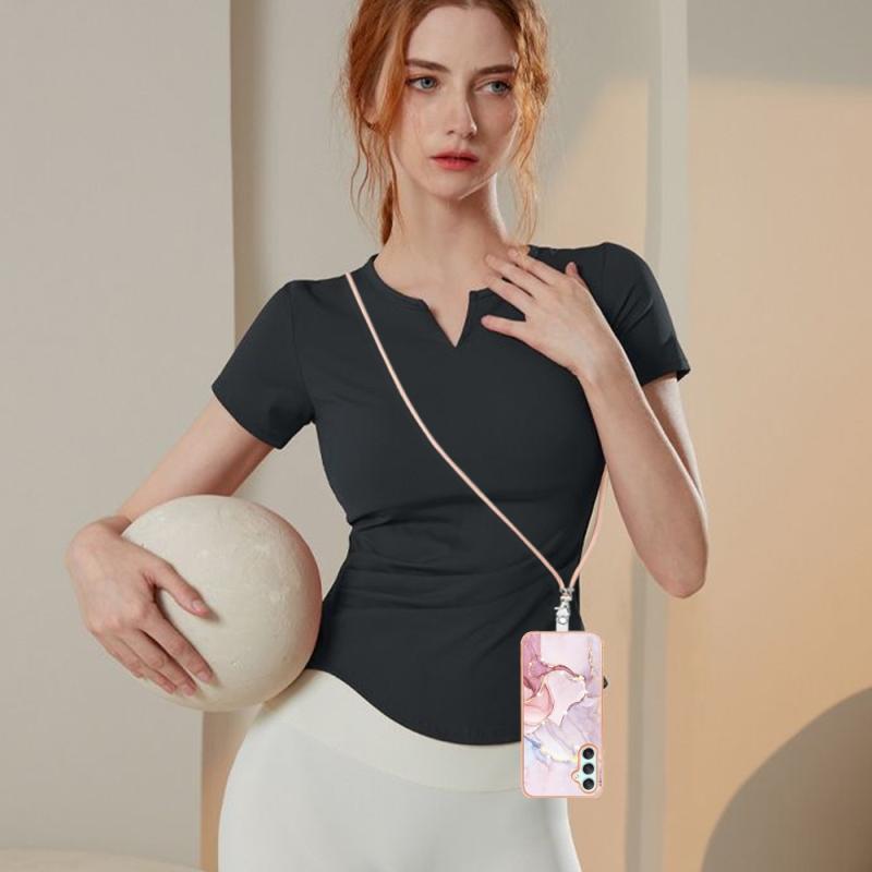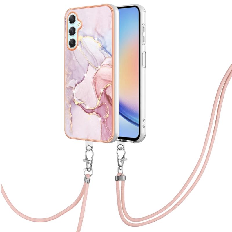 For Samsung Galaxy A25 5G Electroplating Marble Dual-side IMD Phone Case with Lanyard(Rose Gold 005)