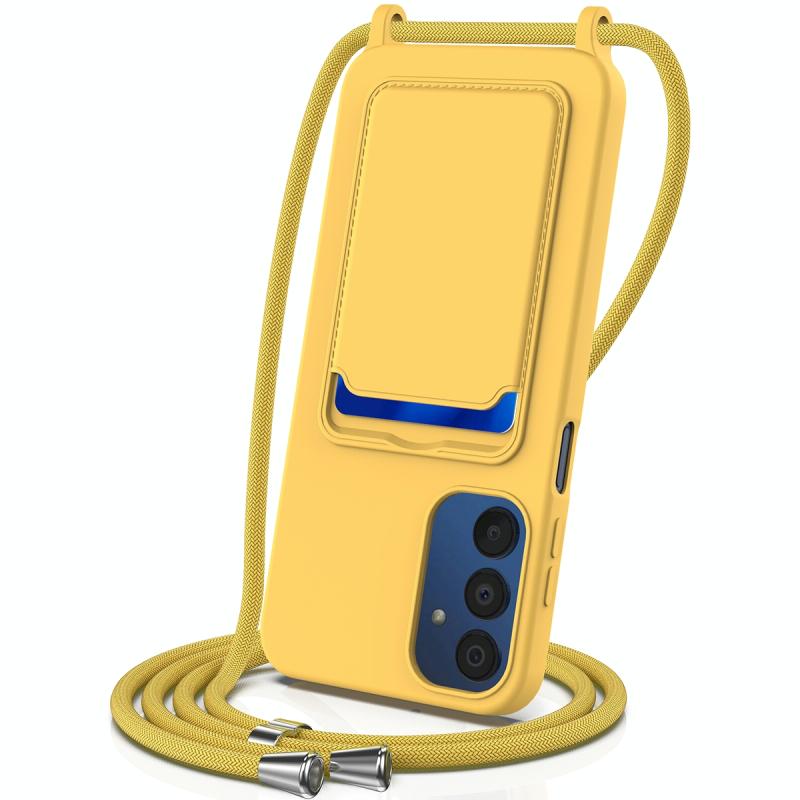 For Samsung Galaxy A25 5G Integrated Card Bag Solid Color Liquid Silicone Phone Case with Lanyard(Yellow)
