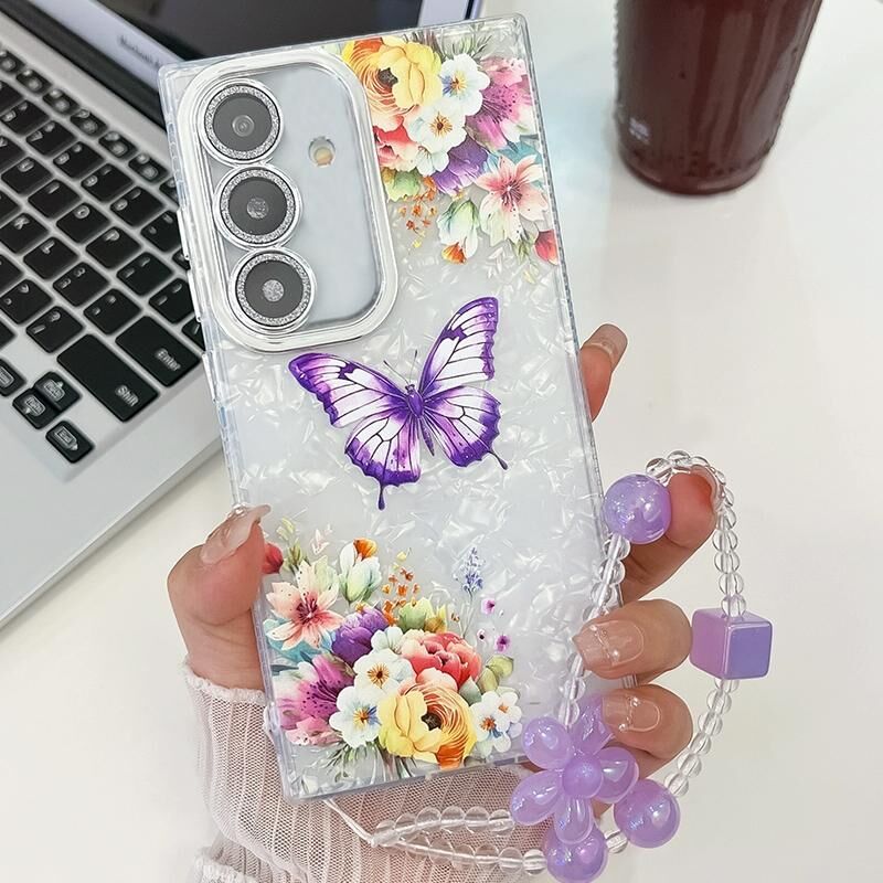 Θήκη κινητού τηλεφώνου Samsung Galaxy A25 5G από TPU με υφή επιμετάλλωσης, βραχιόλι καρπού με σχέδιο πεταλούδας και προστατευτική μεμβράνη φακού με γκλίτερ (Λουλούδια, Πεταλούδες HU1)