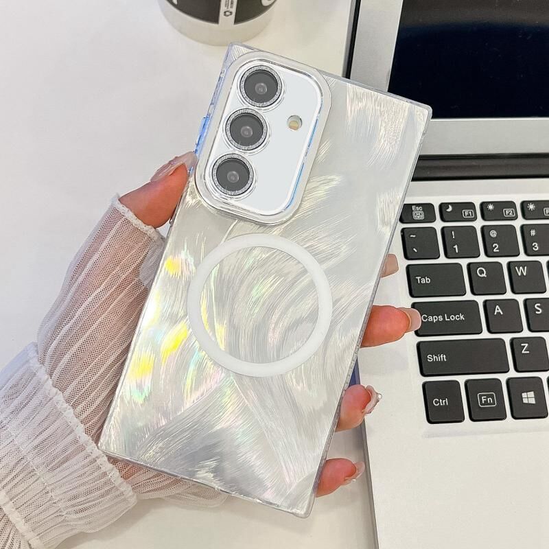 Θήκη κινητού τηλεφώνου Samsung Galaxy A25 5G με υφή επιμετάλλωσης, MagSafe, TPU και μεμβράνη φακού με γκλίτερ (Λευκό Νήμα Πούπουλου)