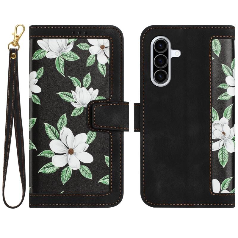 Θήκη τηλεφώνου Samsung Galaxy A26 5G με λουλουδάτο σχέδιο και δερμάτινη υφή, με κορδόνι (Μαύρο)