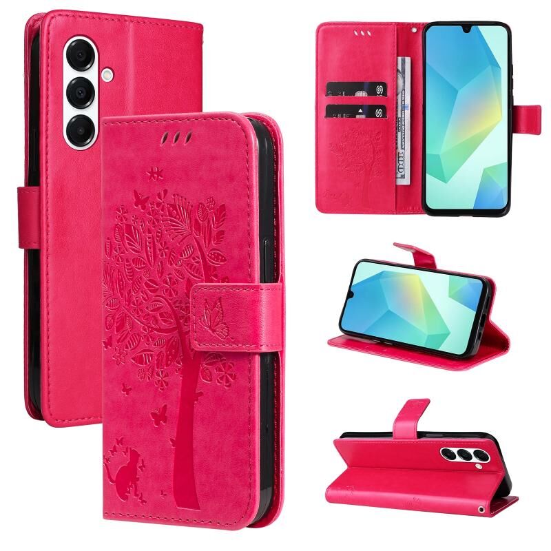 Θήκη τηλεφώνου Samsung Galaxy A26 5G, δερμάτινη, τύπου flip, με παγκόσμιο σχέδιο δέντρου & γάτας σε ανάγλυφο (Ροζ)