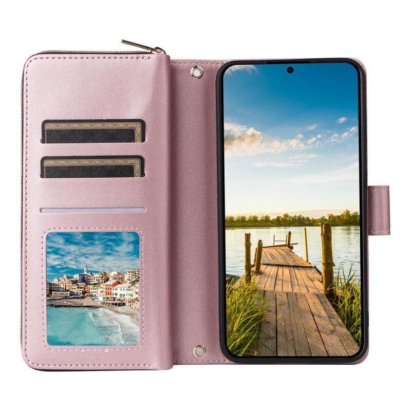 Για Samsung Galaxy A26 Εννέα-κάρτα Slots φερμουάρ πορτοφόλι τσάντα δέρμα υπόθεση τηλεφώνου (Rose Gold)