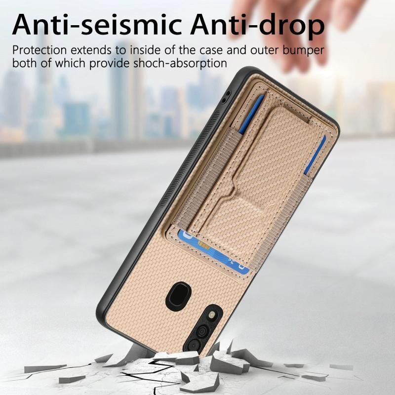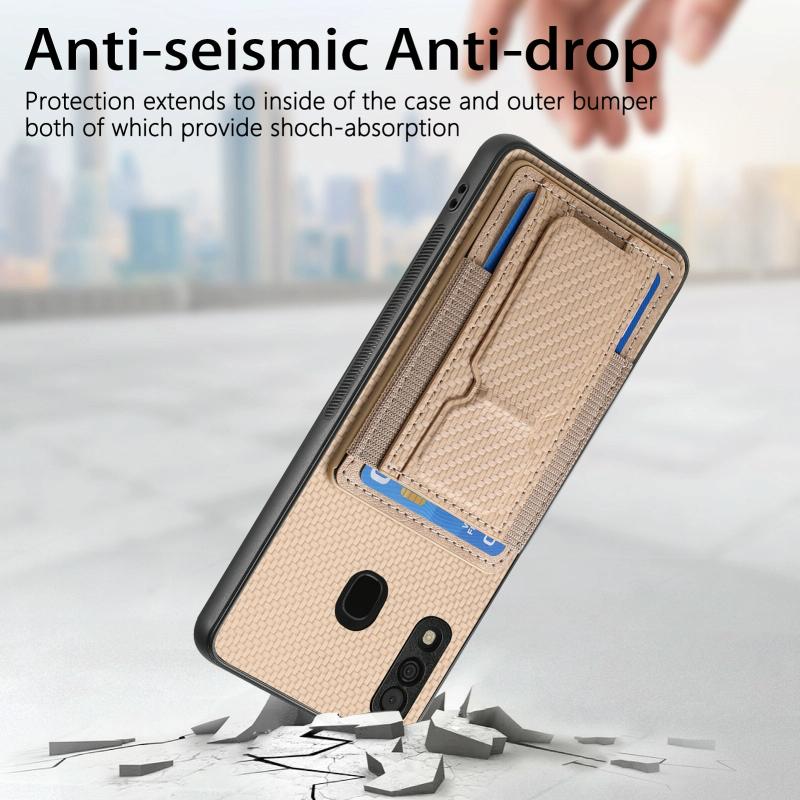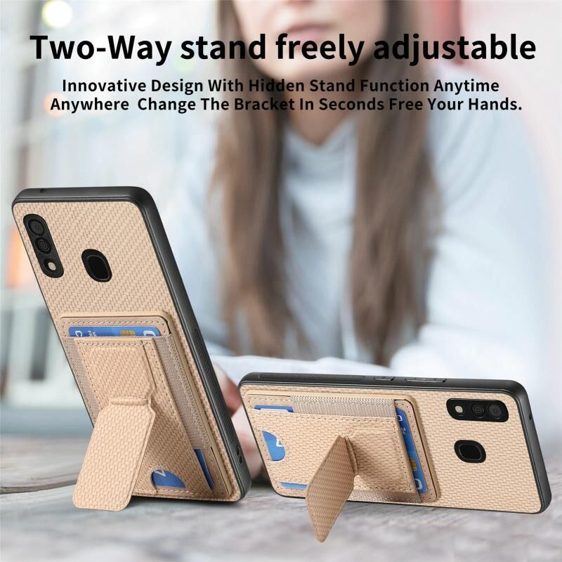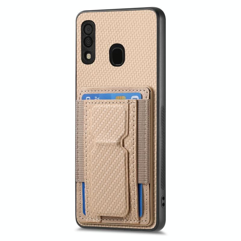 For Samsung Galaxy A30/A20/M10s Carbon Fiber Fold Stand Elastic Card Bag Phone Case(Khaki)