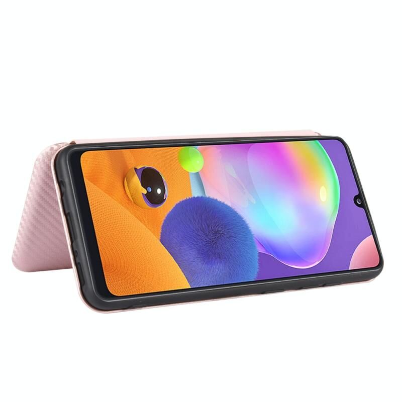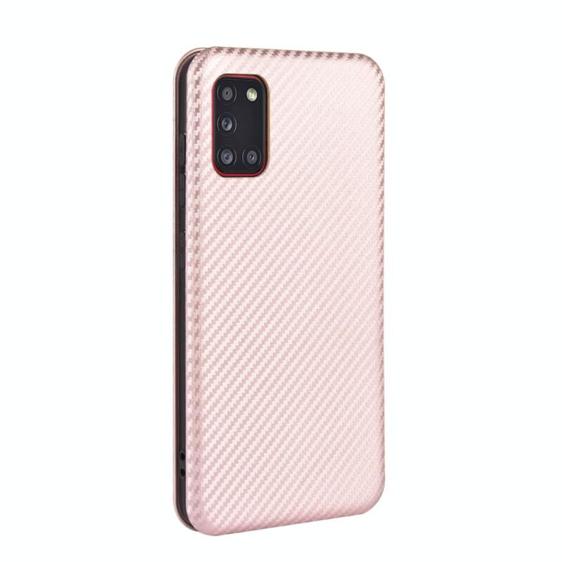Θήκη για Samsung Galaxy A31 με υφή ανθρακονημάτων, οριζόντια, από TPU + PC + Δερματίνη PU με κορδόνι & θήκη για κάρτες (ρόζ)