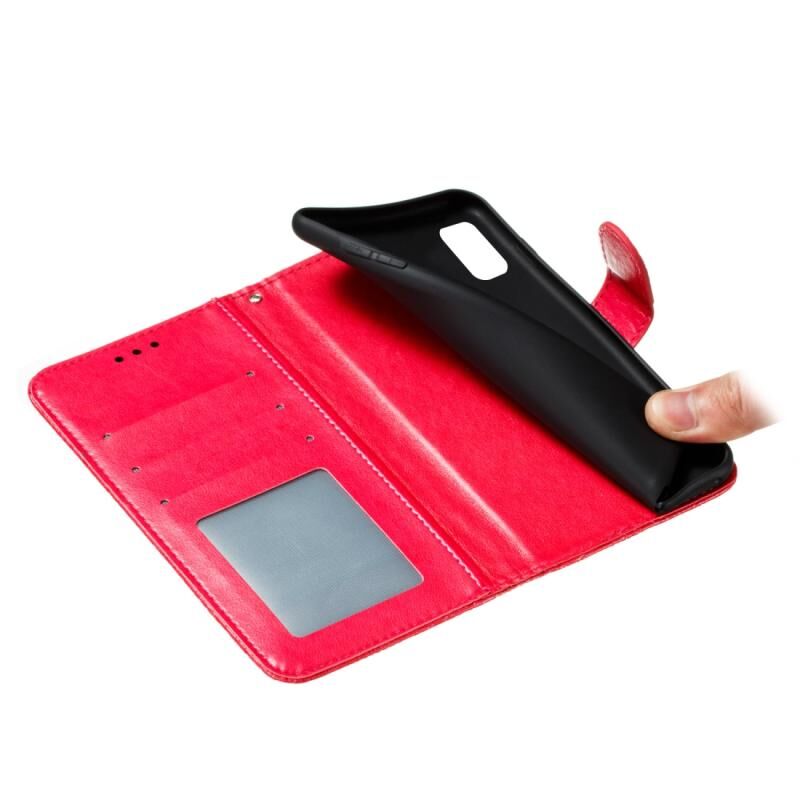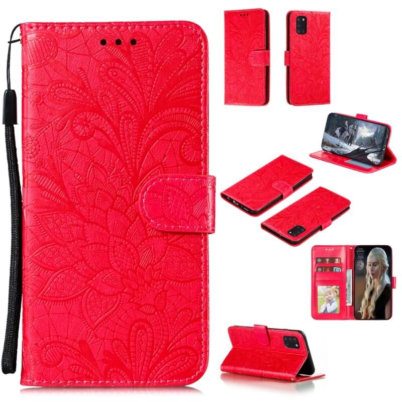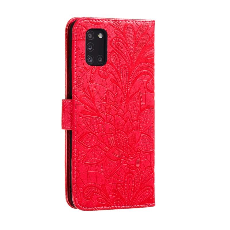 Θήκη Samsung Galaxy A31, δερμάτινη οριζόντια με σχέδιο δαντέλας και ανάγλυφο λουλουδιού, με βάση, θήκες καρτών, πορτοφόλι, κορνίζα φωτογραφιών και κορδόνι (Σκούρο Μπλε)