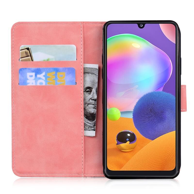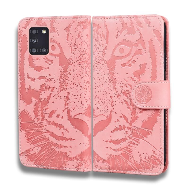 Θήκη Samsung Galaxy A31 από Δέρμα με Οριζόντιο Άνοιγμα, ανάγλυφο σχέδιο τίγρης, με Θήκη & Θήκες Καρτών & Πορτοφόλι (Καφέ)