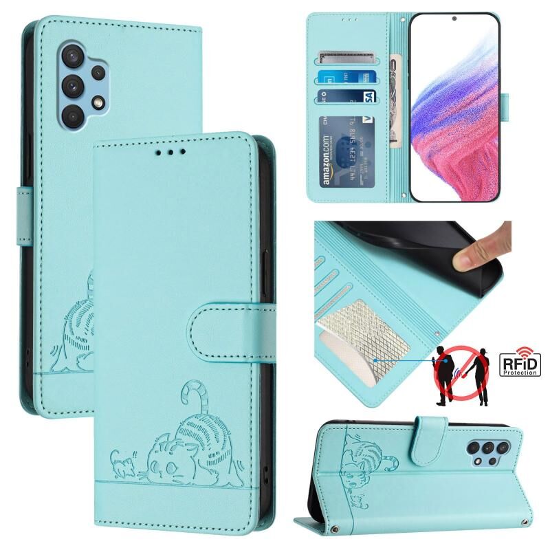 Θήκη τηλεφώνου Samsung Galaxy A32 4G με ανάγλυφο σχέδιο γάτας και σκίουρου, δερμάτινη με λουρί (Μέντας Πράσινο)