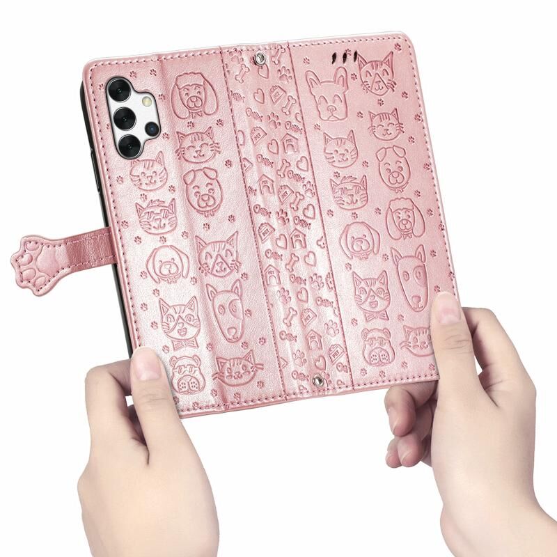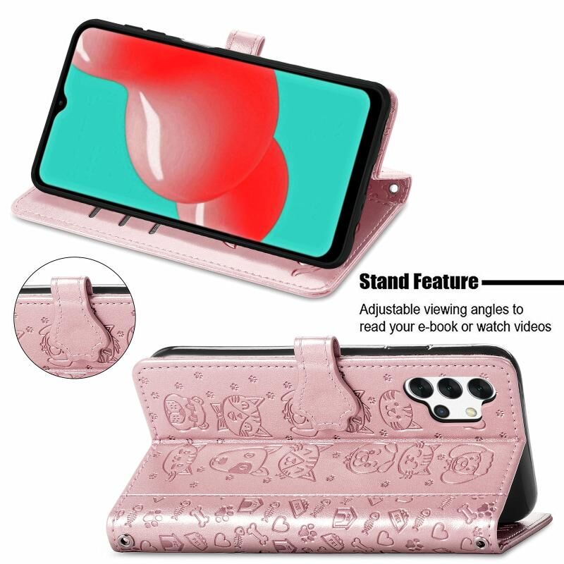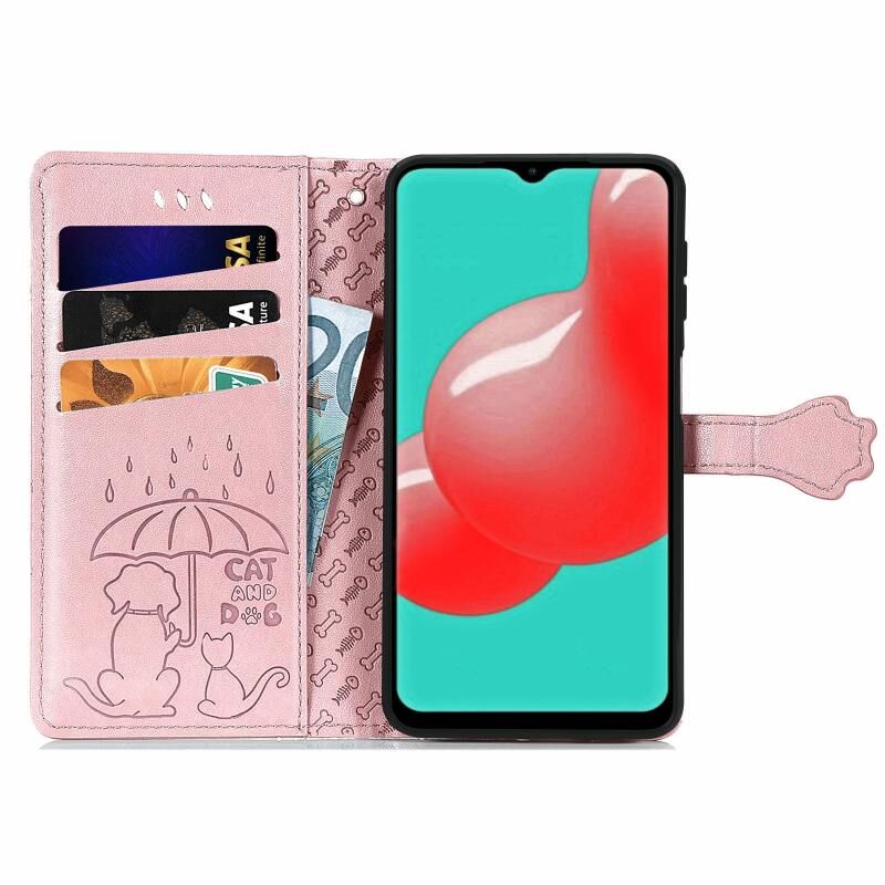 Θήκη Samsung Galaxy A32 4G, χαριτωμένη ανάγλυφη θήκη flip από δέρμα με σχέδια γάτας και σκύλου, με βάση στήριξης, θήκες για κάρτες, πορτοφόλι, λουρί crossbody και κάλυμμα καρτών (Ροζ χρυσός)
