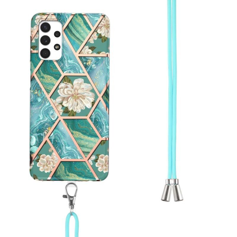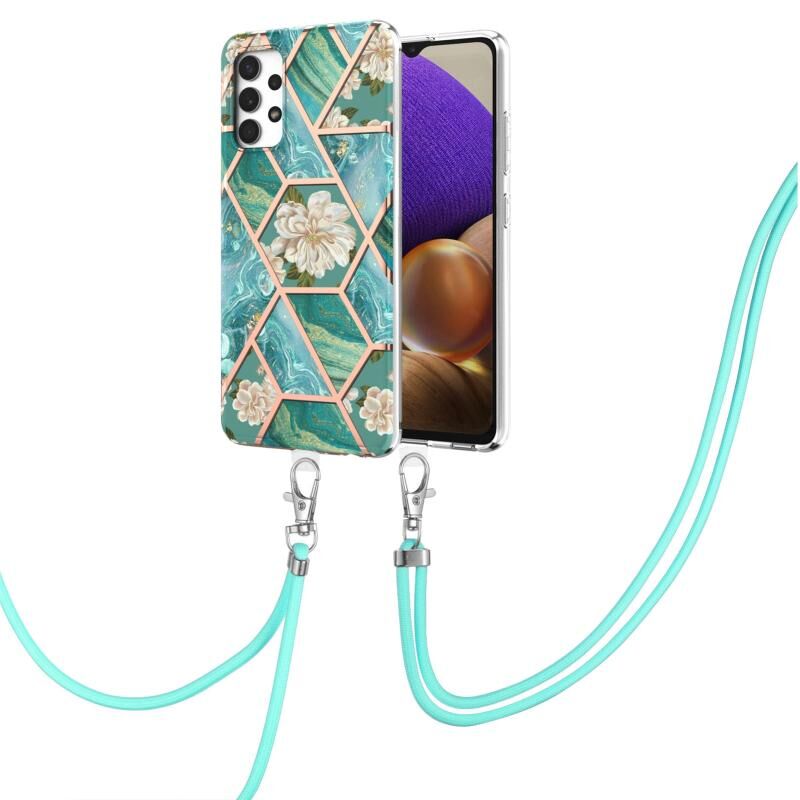 Θήκη για Samsung Galaxy A32 4G EU Version με Επικάλυψη Ηλεκτρολυτικής Επεξεργασίας, Συνδυασμό Μαρμάρου και Λουλουδιών, Αντικραδασμική από TPU με Λουρί (Ροζ Λουλούδι)