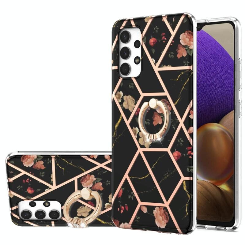 Θήκη για Samsung Galaxy A32 4G EU Version με ηλεκτρολυτική επιμετάλλωση, συνδυασμό μαρμάρου και λουλουδιών, από TPU με αντικραδασμική προστασία και δαχτυλίδι στήριξης με ρητίνες (Ροζ Λουλούδι)