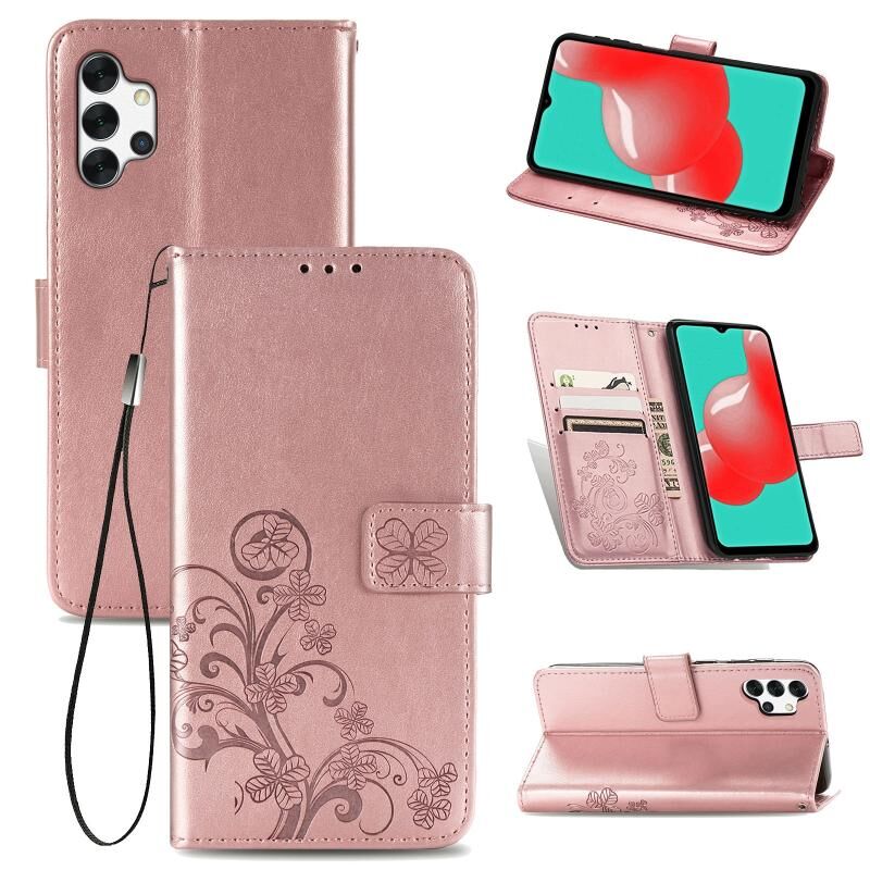 Για Samsung Galaxy A32 4G Four-leaf Clasp ανάγλυφη αγκράφα Κινητό τηλέφωνο προστασία δερμάτινη θήκη με κορδόνι & υποδοχή για κάρτες & πορτοφόλι & βραχίονα λειτουργία (Rose Gold)