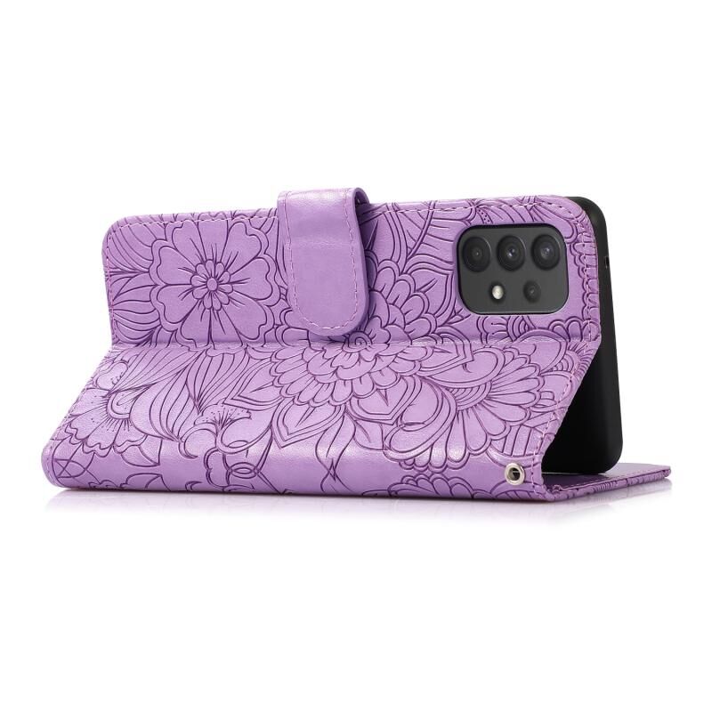 Για Samsung Galaxy A32 4G δέρμα αίσθηση ανάγλυφο ηλιοτρόπιο οριζόντια Flip δερμάτινη θήκη με υποδοχές για κάρτες & θήκες & πορτοφόλι & κορδόνι (μωβ)